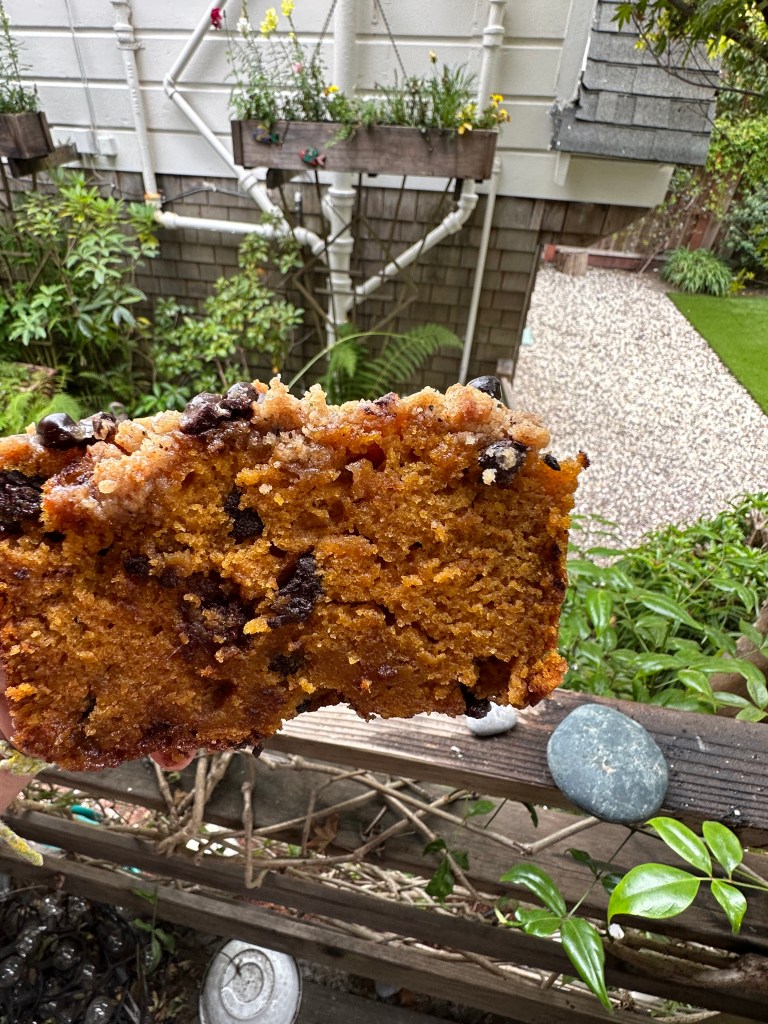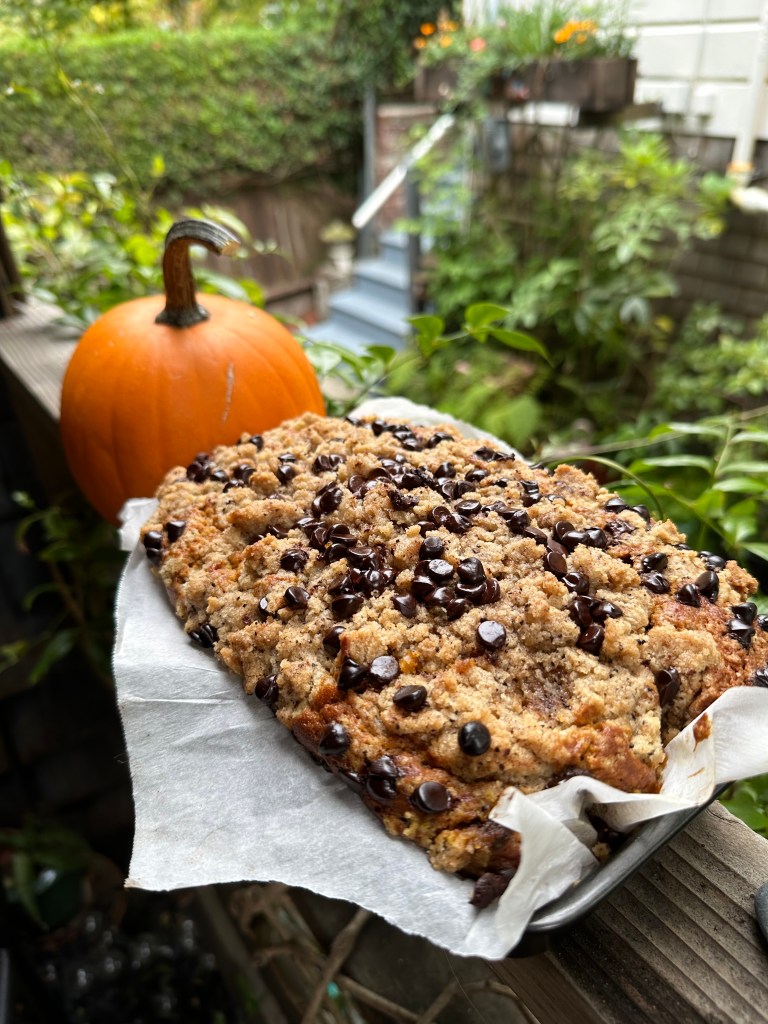 This pumpkin bread was extra special because it has a streusel topping and maple glaze! I decided to add coffee grounds to the streusel topping which I enjoyed because it gave it a more bitter coffee flavor and complemented the bread like a pumpkin spice latte. I also added chocolate chips because I love chocolate with pumpkin. The base of the recipe has oil and milk which gives it a dense and moist texture. It is loaded with cinnamon and pumpkin spice. The bread was super big in my loaf tin and making a decadent slice. I also loved the component of adding a maple glaze. The glaze seeped into the streusel and then hardened up and it cooled. I think this bread would also be good without a strudel and a cinnamon sugar topping or with cream cheese. The recipe was very fast and easy to make. First, the streusel ingredients are combined and put in the fridge to rest. Then, the dry ingredients are combined in one bowl and the wet ingredients in another. The ingredients are all combined with a whisk and then the batter is poured into the loaf pan and baked at 325 for 1 hour – 1 hour 20 minutes. The wait time is perfect for reading a book, catching up on work, or watching a movie. Here is a photo of the final product! So decadent and delicious. Also, your house is going to smell super delicious.